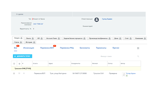 Так как компания «РОСИНКАС» часто сотрудничает с клиентами, имеющими разветвленную структуру (с большим количеством подразделений внутри), то было реализовано создание и отображение этой структуры в рамках карточки клиента.