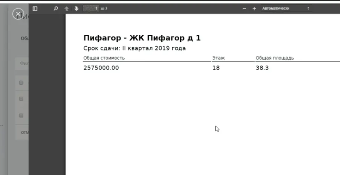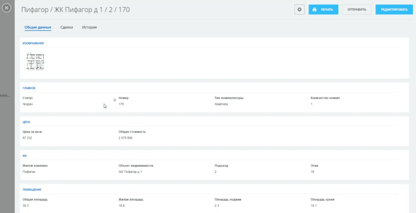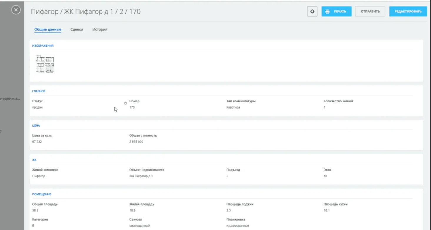 После выбора необходимого объекта открывается новая карточка сделки, где отображается подробная информация по объекту.