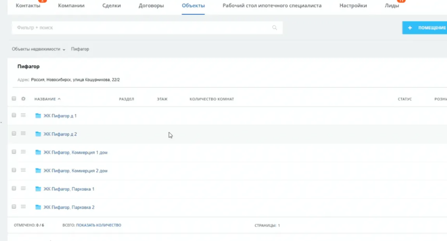 Чтобы структурировать информацию об актуальных объектах недвижимости, мы переработали штатный раздел Товары. Был реализован удобный раздел с дроблением на жилые комплексы, дома, подъезды с возможностью визуального отображения в виде «шахматки объектов».