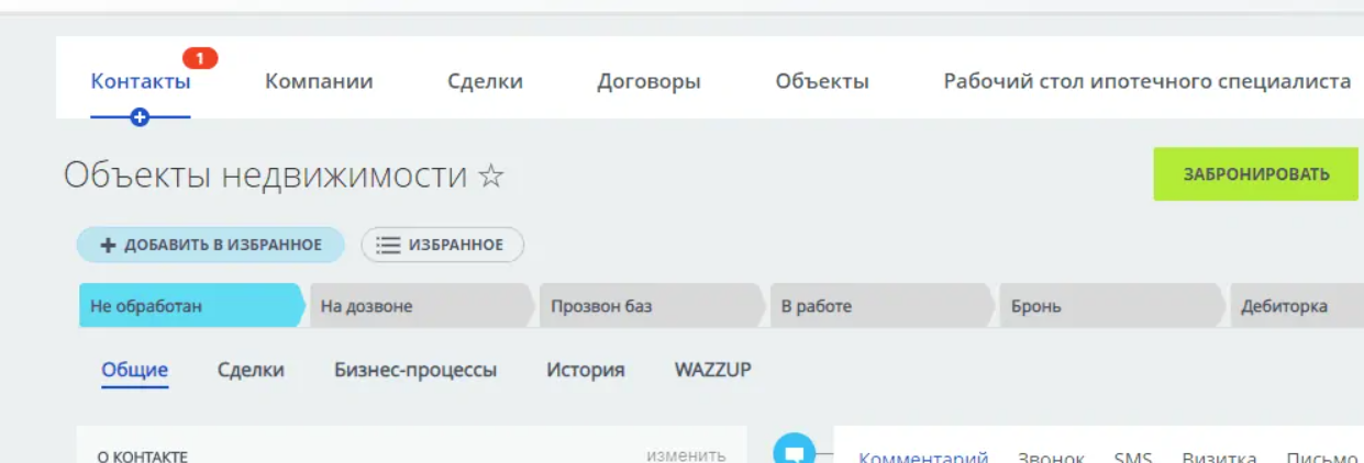 В блоке СRM во вкладке "сделки" менеджер может легко выбрать понравившуюся квартиру для клиента и забронировать её, нажав на кнопку «Забронировать».