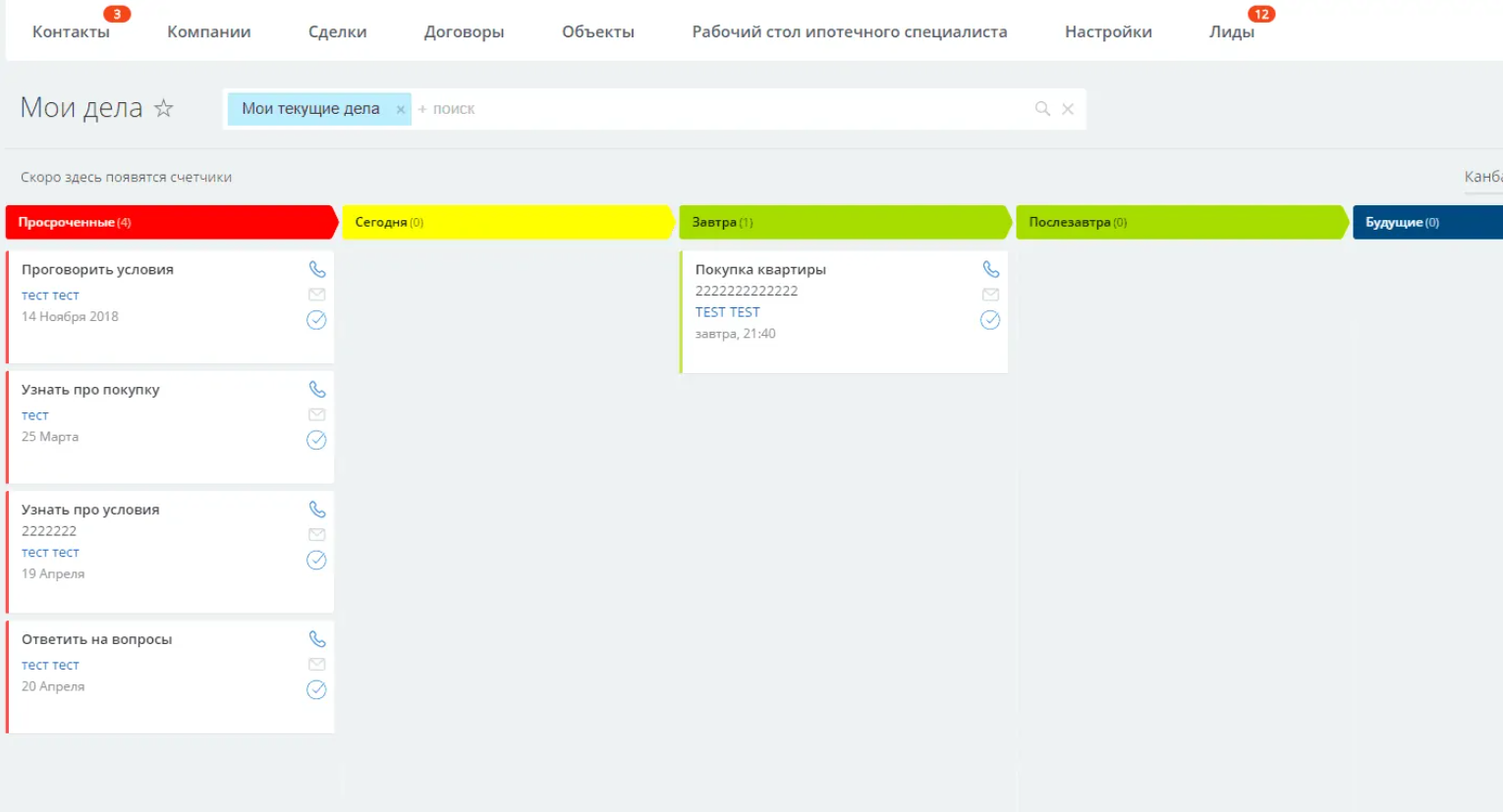 - Стартовая страница - это раздел «Мои дела» в виде канбан-доски, который помогает управлять потоками задач.